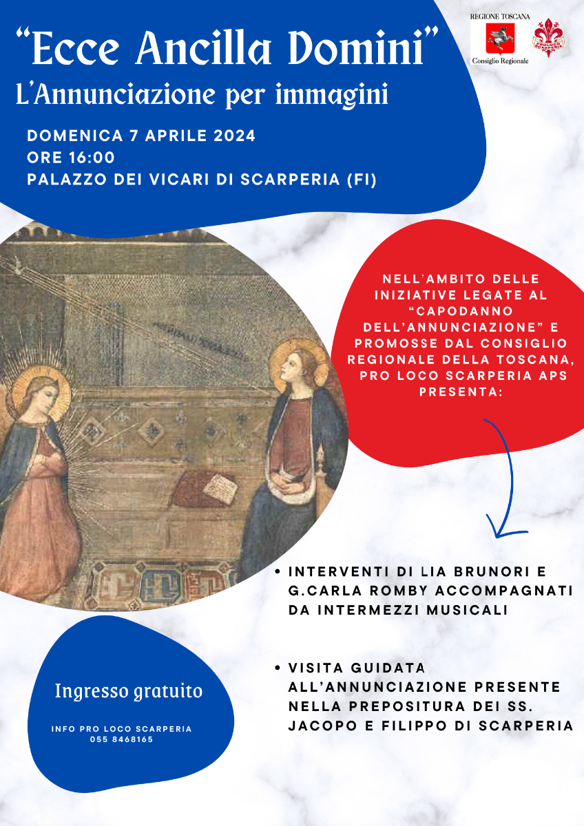 Sunday, April 7th, as part of the initiatives related to the "Annunciation New Year" promoted by the Regional Council of Tuscany, Pro Loco Scarperia APS presents: "Ecce Ancilla Domini. The Annunciation through images", at 4:00 PM in the Tapestry Hall of Palazzo dei Vicari.
