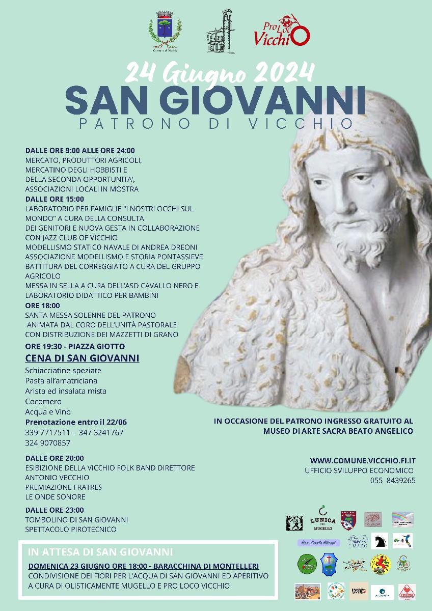 Extraordinary market, agricultural producers, hobby market and second chance, stands of local associations, activities and workshops, cultural initiatives, entertainment and musical entertainment, dinner in San Giovanni... Vicchio in feast! A day full of events to celebrate the Patron Saint together with the community vicchiese.
