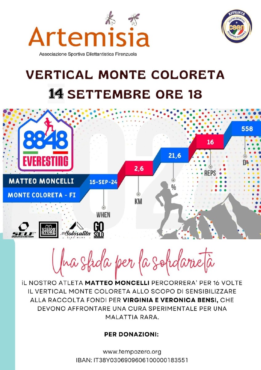Sport teaches us to never give up, both in sporting activities and in life. Matteo Moncelli will transform his personal challenge into a solidarity one, covering the "Vertical Monte Coloreta" 16 times, with a positive difference in altitude of 9248 and a total of 83 km. The challenge will be on 14 September 2024 at 6pm.