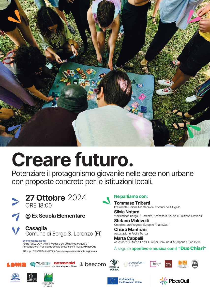 On Sunday, October 27th, the Beecom Social Promotion Association, together with Foglia Tonda ODV and the Unione Montana dei Comuni del Mugello, is organizing, as part of the European Project “PlaceOut!”, a day of meetings in Casaglia at the former Elementary School to discuss, alongside local administrators, the future of our territory.