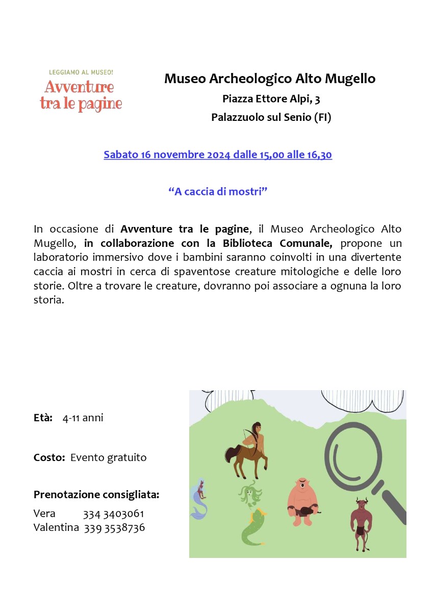On the occasion of Adventures among the Pages, the Upper Mugello Archaeological Museum, in collaboration with the Municipal Library, offers an immersive workshop where children will be involved in a fun monster hunt in search of frightening mythological creatures and their stories. As well as finding the creatures, they will then have to associate each one with their story.