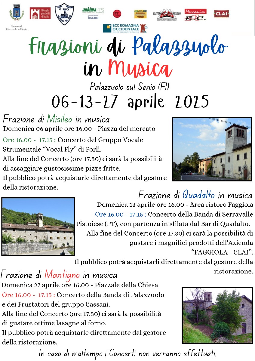 4 p.m. - 5.15 p.m. : Concert by the Palazzuolo band and the Cassani group whippers. At the end of the concert (5.30 p.m.), there will be an opportunity to taste delicious lasagne baked in the oven. The public will be able to buy them directly from the catering company.