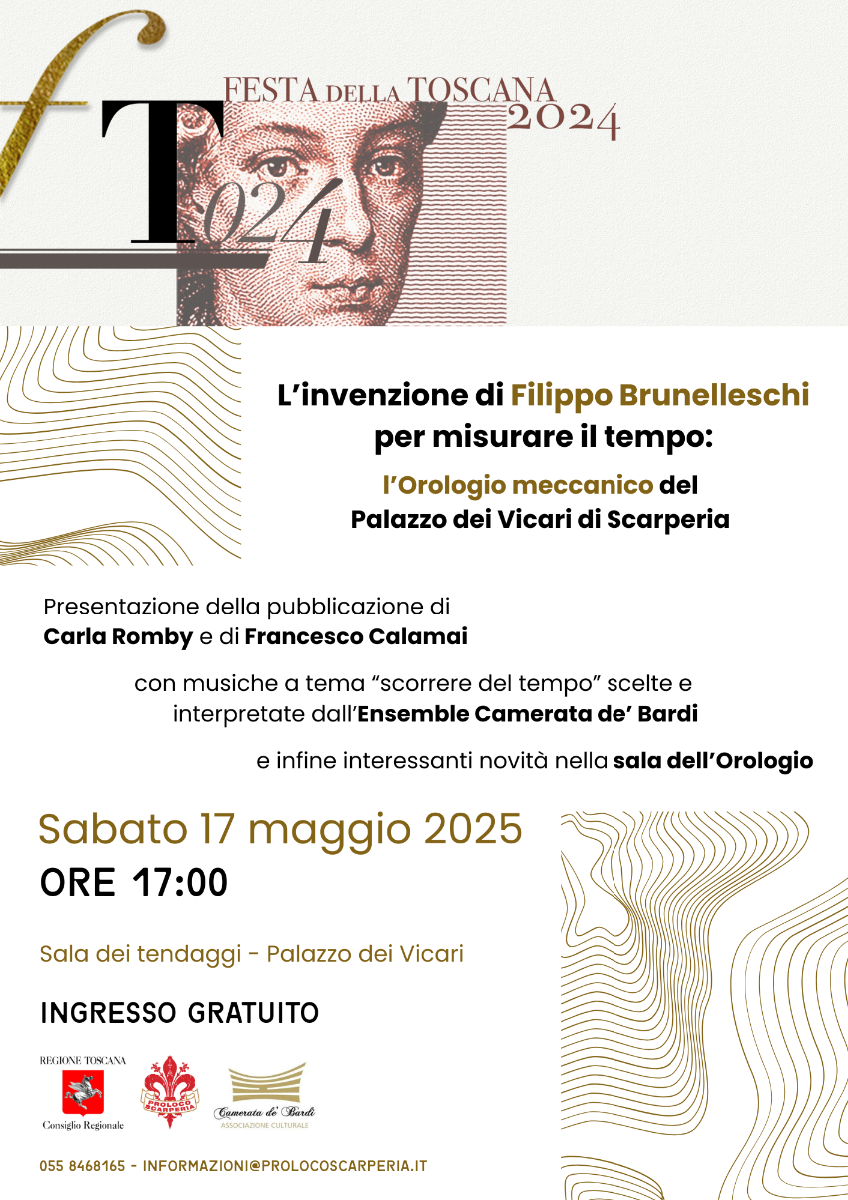 Quest’anno vi appettiamo sabato 17 maggio alle ore 17:00 nel Salone dei Tendaggi per presentarvi “ L’invenzione di Filippo Brunelleschi per misurare il tempo: l’orologio meccanico del Palazzo dei Vicari di Scarperia”, una pubblicazione che svela grandi novità sul maestro del Rinascimento.