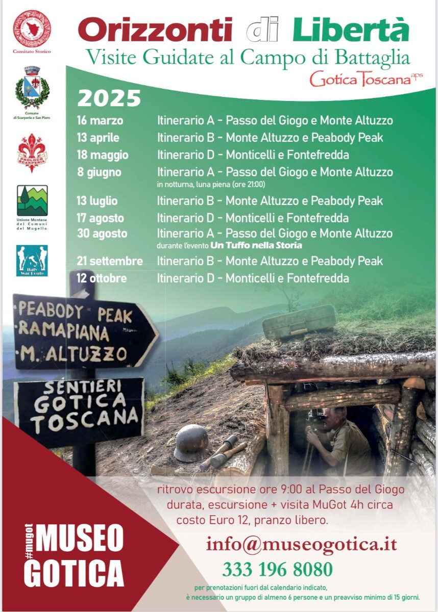 ORIZZONTI DI LIBERTA' (HORIZONS OF FREEDOM) is a calendar of guided excursions by Gotica Toscana aps to present the battlefield of Passo del Giogo from Monticelli to Monte Altuzzo live in nature