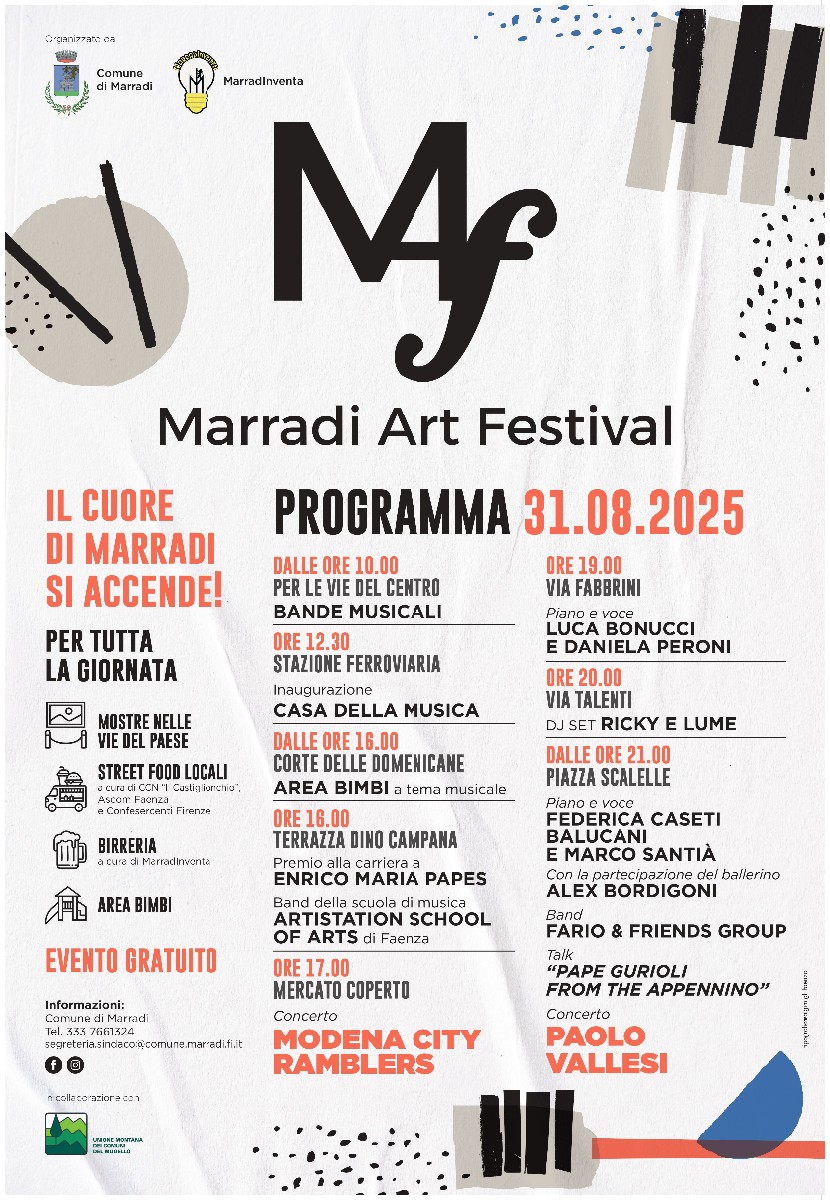 Un evento gratuito, organizzato dal Comune di Marradi e MarradiInventa, con la collaborazione dell’Unione Montana dei Comuni del Mugello: un’occasione unica per vivere l’arte e la musica in uno dei borghi più suggestivi dell’Appennino Tosco-Romagnolo.