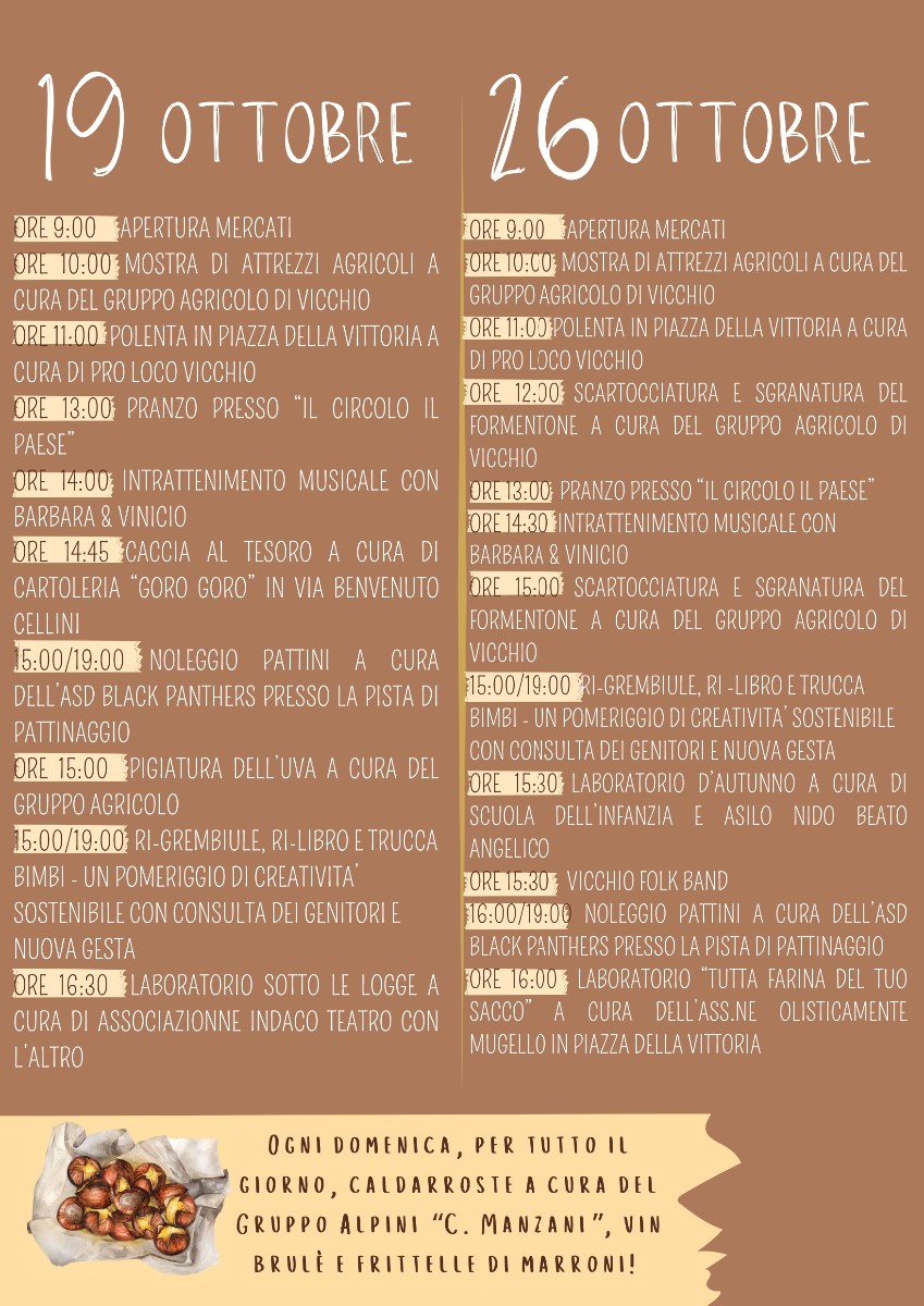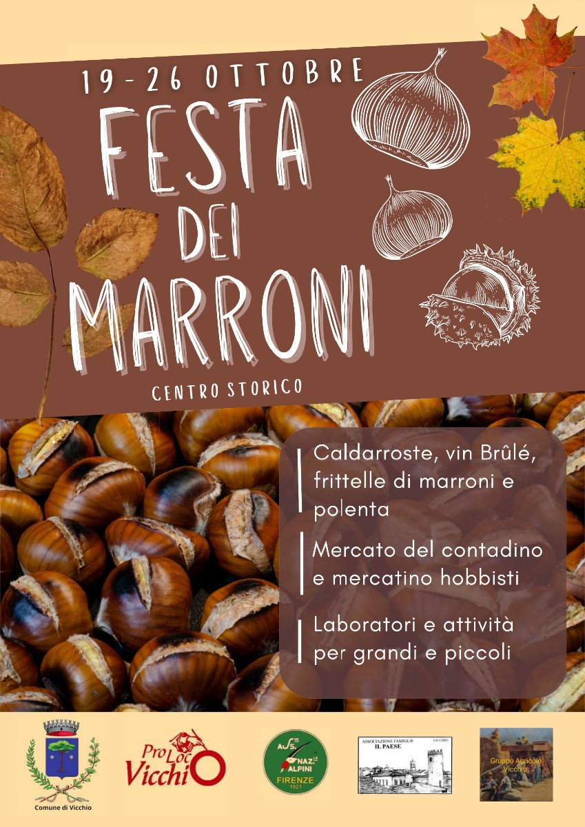 In Vicchio, two delicious events with marroni, but not only. The customary ‘Festa dei Marroni’ (Chestnut Festival) returns to the historic centre on Sunday 19 and Sunday 26 October: roasted chestnuts, polenta, mulled wine and chestnut fritters, as well as agricultural producers with local specialities, an extraordinary market and hobby market, demonstrations of formentone (chestnut husk) cutting and grape crushing, workshops and activities for both adults and children, musical entertainment and much more.