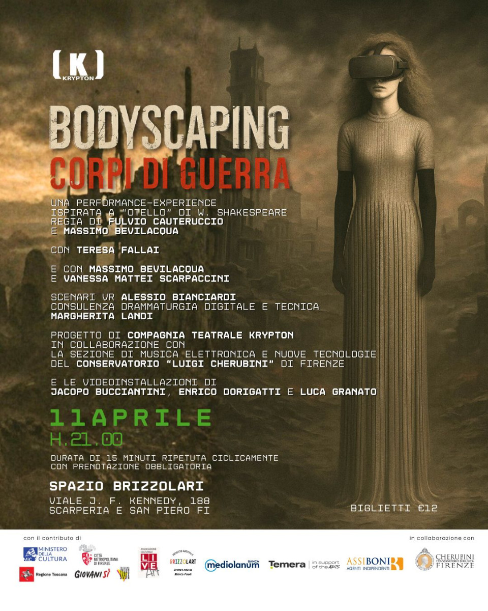 A performance-experience inspired by Shakespeare's "Othello" directed by Fulvio Cauteruccio and Massimo Bevilacqua with Teresa Fallai and featuring Massimo Bevilacqua and Vanessa Mattei Scarpaccini. Bodyscaping is an immersive performance that interweaves theater, virtual reality, and sound design to recount the invisible and daily violence suffered by women in places of war, whether real or internal. The work, inspired by Shakespeare's Othello, no longer focuses on jealousy, but on the transformation of love into domination, trust into possession, and words into wounds. Desdemona becomes every woman imprisoned by suspicion, fear, and control. The feminine is a sacrificial body and oracle, a prophetic voice and residue. Man—Othello, Iago, the conflict itself—is the structure that implodes, incapable of containing its own violence. The performance experience, lasting approximately 15 minutes, is repeated cyclically and organized into three sessions (starting at 9:00 PM, 9:30 PM, and 10:00 PM) for a maximum of 10 people per session.