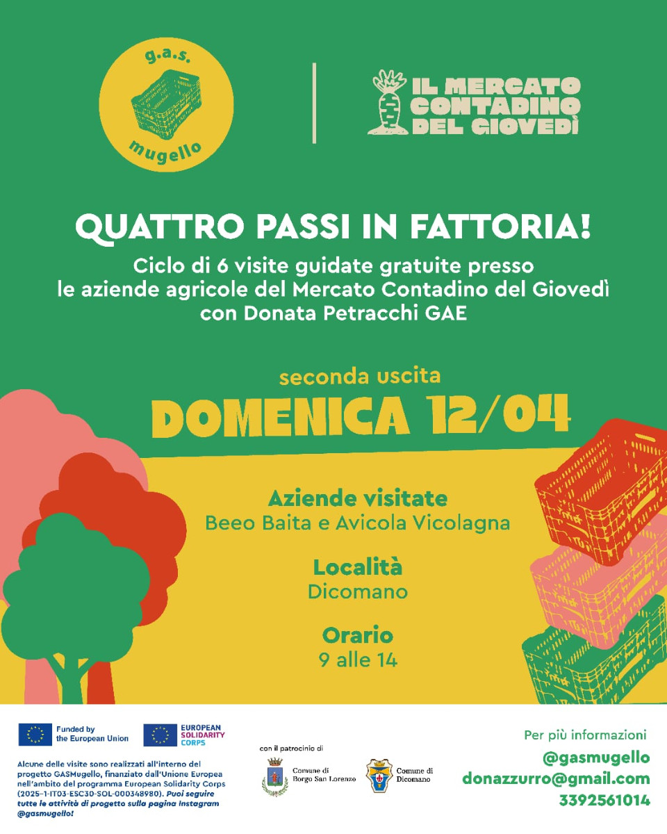 Reservations and information: Contact Donata Petracchi (Guide) at +39 339 2561014 (also WhatsApp). This initiative is part of a series of six guided tours dedicated to discovering Mugello farms, with the aim of promoting greater awareness of local and sustainable consumption. Some activities are part of the GASMugello project, funded by the European Union under the European Solidarity Corps program. The organizers reserve the right to make changes or cancel the program if necessary.