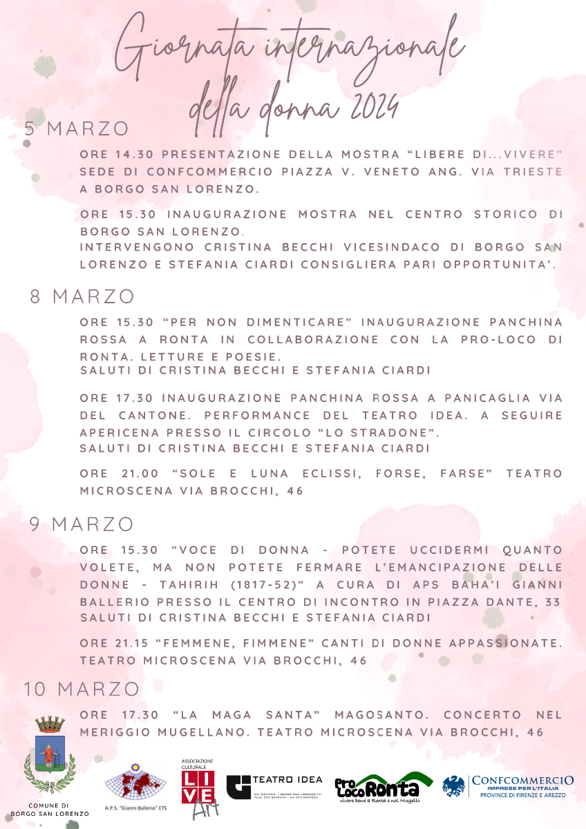 A Borgo San Lorenzo, in occasione della Giornata Internazionale della Donna, l’Amministrazione ha patrocinato una serie di eventi che ci accompagneranno per tutta la settimana.