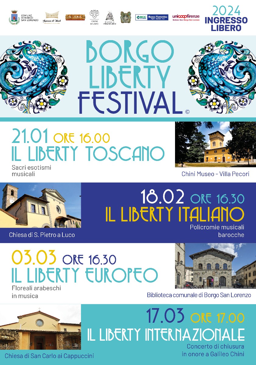 • Domenica 3 marzo 2024, alle ore 16.30, “Floreali arabeschi in Musica” risuoneranno nel Palazzo del Podestà, sede della Biblioteca Comunale borghigiana per celebrare il Liberty Europeo.