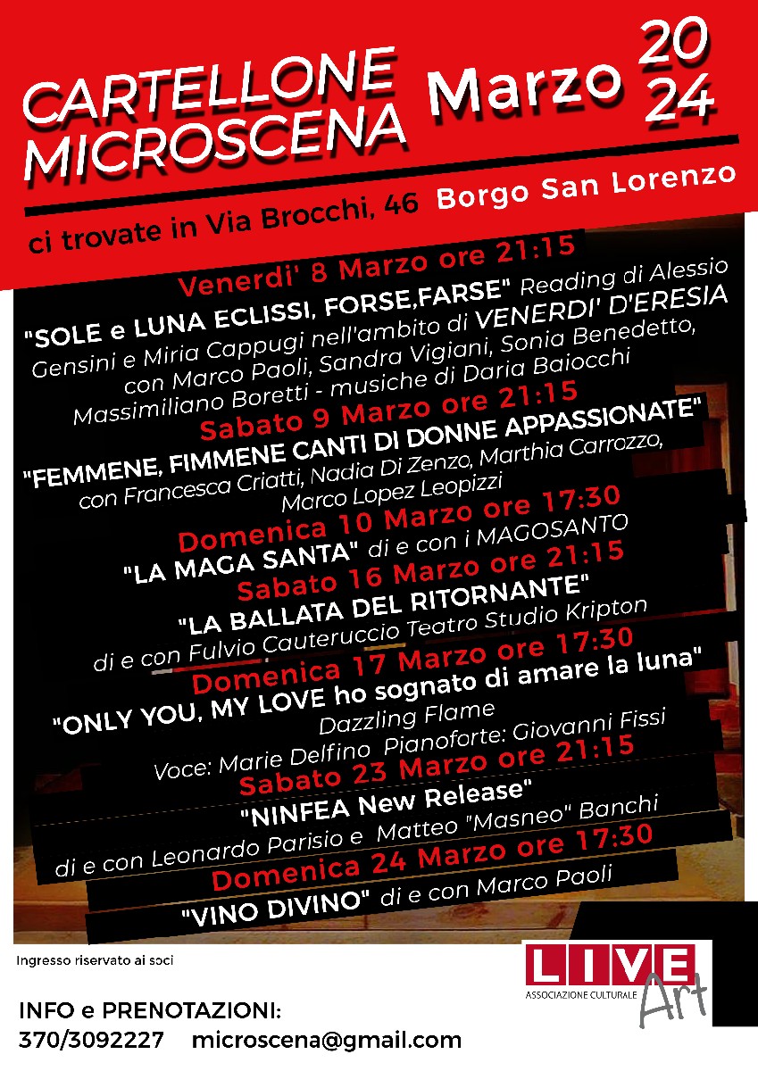 - Venerdì 8 Marzo ore 21.15 - Sole e Luna, eclisse, forse, farse Reading di Ezio Alessio Gensini e Miria Cappugi con Marco Paoli, Sandra Vigiani, Soni Benedetto, Massimiliano Boretti. Musche di Daria Baiocchi