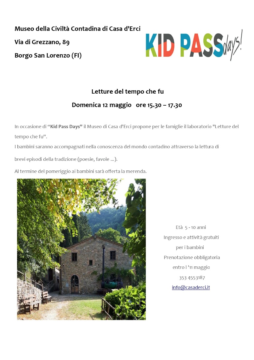In occasione di “Kid Pass Days” il Museo di Casa d’Erci propone per le famiglie il laboratorio "Letture del tempo che fu”. I bambini saranno accompagnati nella conoscenza del mondo contadino attraverso la lettura di