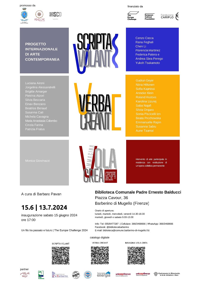 Parafrasando la celeberrima frase pronunciata da Caio Tito al senato romano e divenuta ormai un proverbio popolarissimo, SCRIPTA VOLANT è una delle tre sezioni in cui è articolato questo progetto internazionale pensato per Barberino di Mugello e che ha nella sua Biblioteca il fulcro espositivo. Sei artisti contemporanei internazionali – Cenzo Cocca, Chen Li, Rana Feghali, Florencia Martinez, Federica Patera e Andrea Sbra Perego, Yukoh Tsukamoto - di provenienza, generazione e background differenti hanno lavorato ad altrettante opere declinando testo e tessitura, letteratura e fiber art in un intreccio che testimonia come la scrittura sia (fino ad oggi) un veicolo per traghettare idee, pensieri ed emozioni oltre il limite spaziale e temporale, legando attraverso un filo continuo l’umanità alla sua storia e alle sue storie, alle sue molteplici identità, all’evoluzione degli individui in seno a comunità e società in una perenne trasformazione.