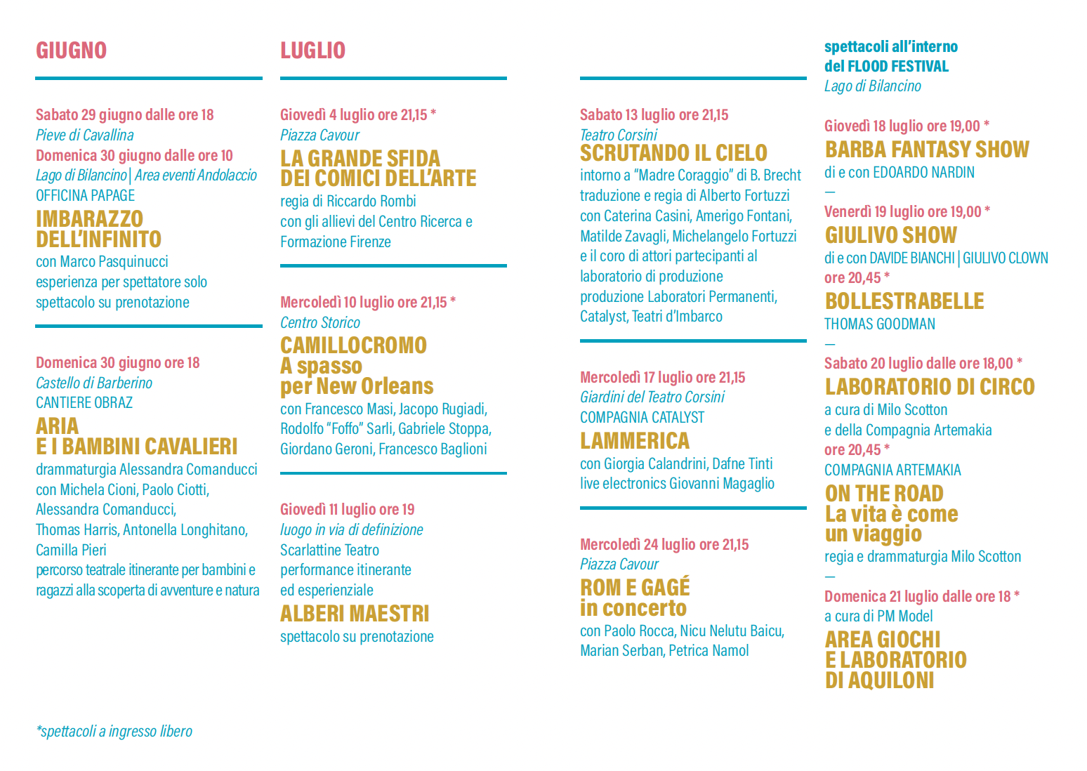 La rinascita della bellezza prosegue le linee della programmazione invernale, rivolta ad un pubblico di adulti e famiglie e “occupa” il luoghi più suggestivi del territorio di Barberino con spettacoli di grande qualità ma di “impatto” leggero. L’estate diventa inoltre l’occasione per riconsolidare le forti relazioni di Catalyst con le realtà culturali del territorio, inserendo le sue proposte di programmazione all’interno di eventi quali i Mercoledì in Piazza o il Flood Festival, un Filo di…, arricchendo e definendo il programma di tali iniziative.