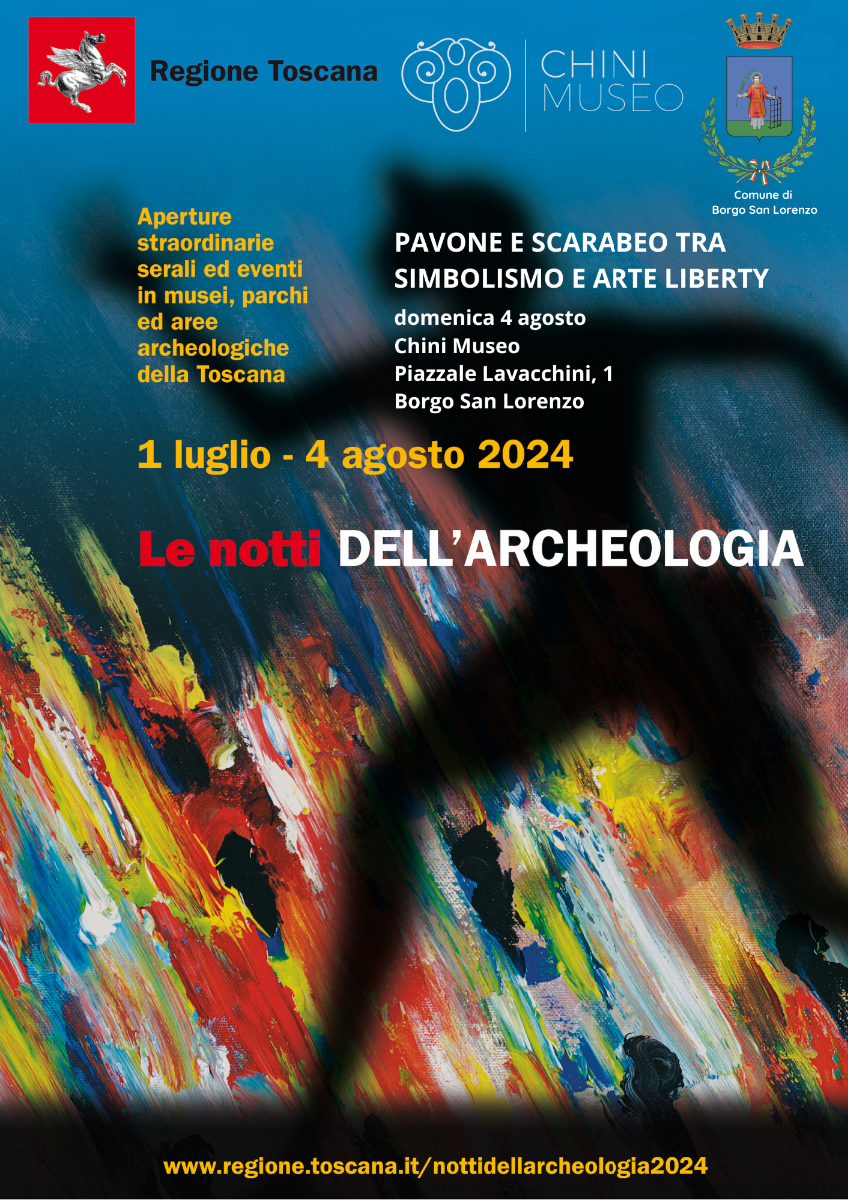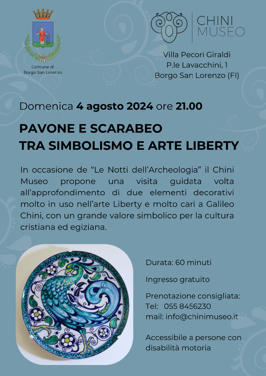 In occasione de “Le Notti dell’Archeologia” il Chini Museo propone una visita guidata gratuita dal titolo 'Pavone e scarabeo tra Simbolismo e arte Liberty' volta all’approfondimento di due elementi decorativi molto in uso nell’arte Liberty e molto cari a Galileo Chini, con un grande valore simbolico per la cultura cristiana ed egiziana.