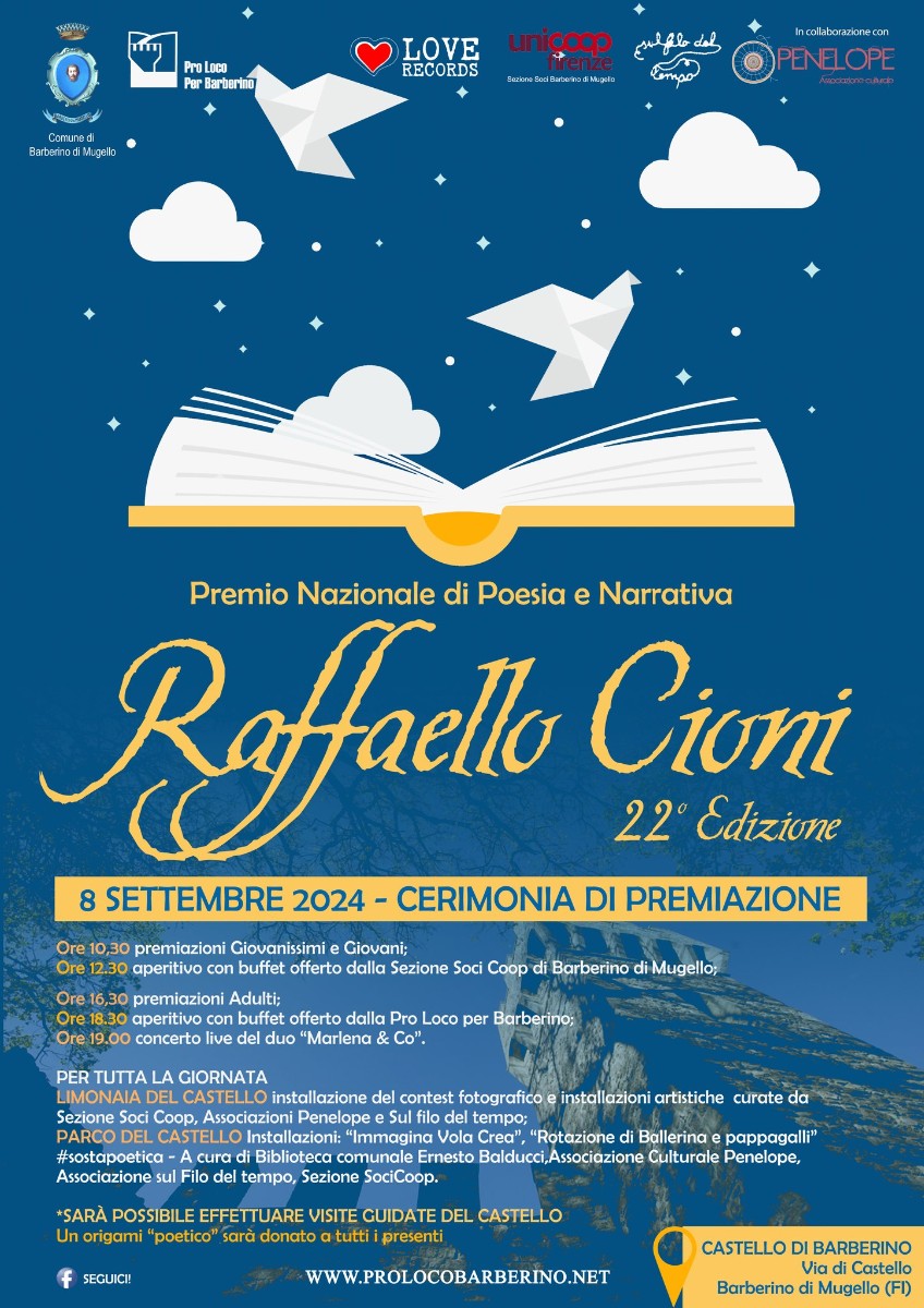 Domenica 8 Settembre le premiazioni della ventiduesima edizione del Premio Nazionale di Poesia e Narrativa "Raffaello Cioni" che anche quest'anno ha visto la partecipazione di scrittrici e scrittori da tutta Italia con oltre 600 opere in gara!