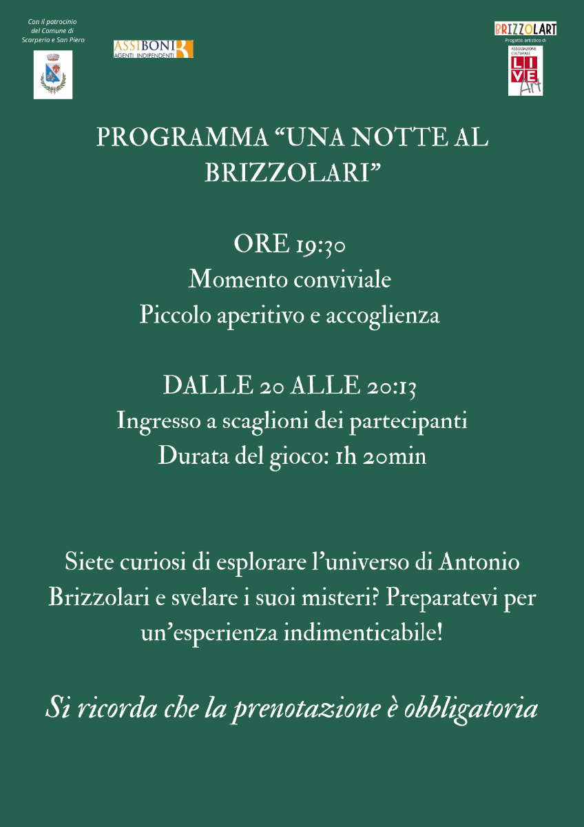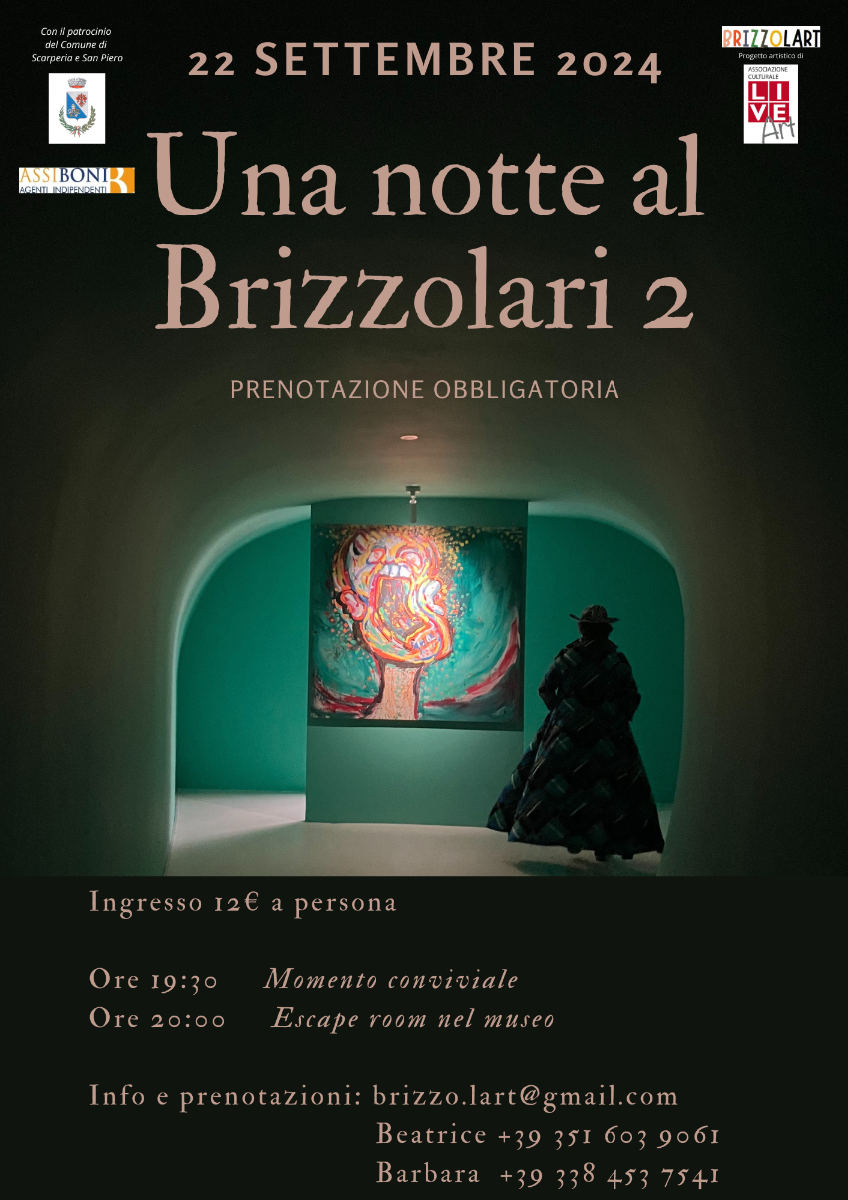 Ti invitiamo a partecipare a "Una Notte al Brizzolari 2", un'esperienza unica che si terrà domenica 22 settembre 2024 a partire dalle ore 19:30 presso lo Spazio Brizzolari a Scarperia.