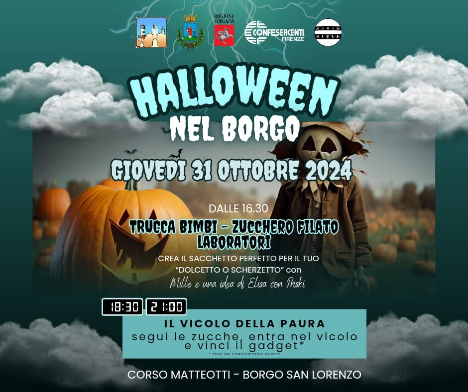 Giovedì 31 Ottobre a partire dalle 16.30 nel centro storico di Borgo San Lorenzo si terrà l’iniziativa “Halloween nel Borgo”, organizzata dagli esercenti aderenti al Centro Commerciale Naturale Comitato “Nel Borgo”.