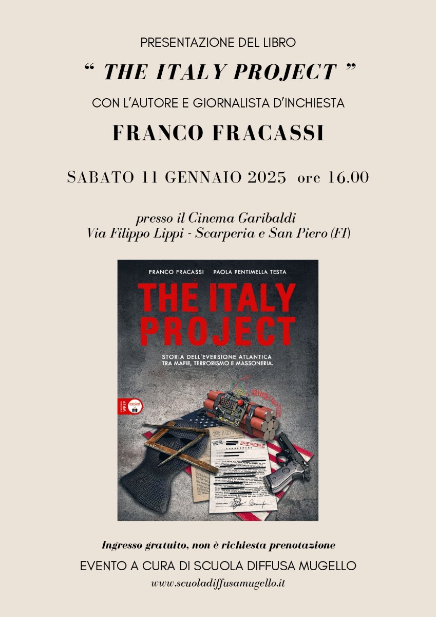 Sabato 11 gennaio 2025 alle ore 16:00 si terrà presso il cinema Garibaldi di Scarperia e San Piero la presentazione del libro a cura della Scuola Diffusa del Mugello dal titolo "The Italy project" con l'autore e giornalista d'inchiesta Franco Fracassi