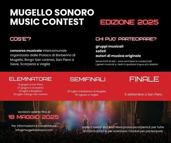 è un concorso/vetrina intercomunale organizzato dalle Proloco di Barberino di Mugello, Borgo San Lorenzo, San Piero a Sieve, Scarperia e Vaglia, con l'obiettivo di promuovere la musica e il suo valore culturale e formativo all’interno della società. Un evento speciale promosso con il patrocinio della Regione Toscana, della Città Metropolitana, dell’Unione dei Comuni del Mugello e dei Comuni.