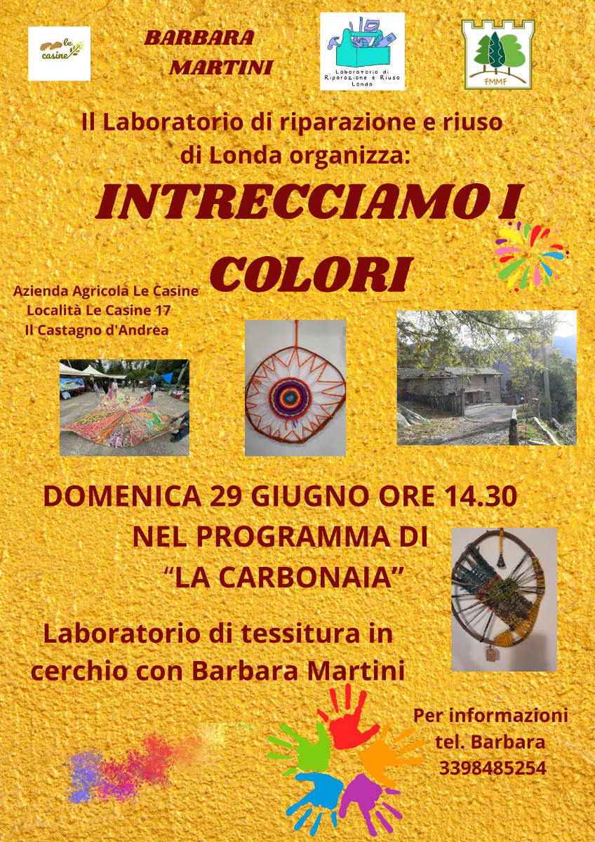 Dalle 14.30 “Disegnare con il carbone” a cura di Silvia Bolognesi (attività per maggiori di 12 anni, gradita la prenotazione massimo 10 partecipanti, messaggio whattsapp a Silvia 3490913781), “Intrecciamo i colori” laboratorio di tessitura in cerchio con Barbara Martini in collaborazione con il Laboratorio di riparazione e riuso di Londa, Laboratorio di tessitura con telaio nomade e a terra a cura di Cinzia Giorgi.