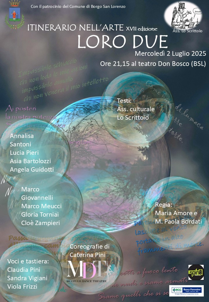 Madre terra ci sta lanciando più di un grido di aiuto. Cambiamento climatico, inquinamento, desertificazione. Quanto di quel grido siamo disposti ad ascoltare? Un interrogativo che dalle pratiche del viver quotidiano diventa poesia ed arte. Accade in “Itinerario nell’arte” la XVII edizione della serata spettacolo tra poesia, musica e danza, ideata e messa in scena dall’Associazione Lo Scrittoio di Borgo San Lorenzo. Mercoledì 2 Luglio sul palco del Teatro Don Bosco di Borgo San Lorenzo riflettori accesi su “Loro Due”, per la regia di Maria Amore e Maria Paola Bordati testi a cura dell’Associazione Lo Scrittoio.