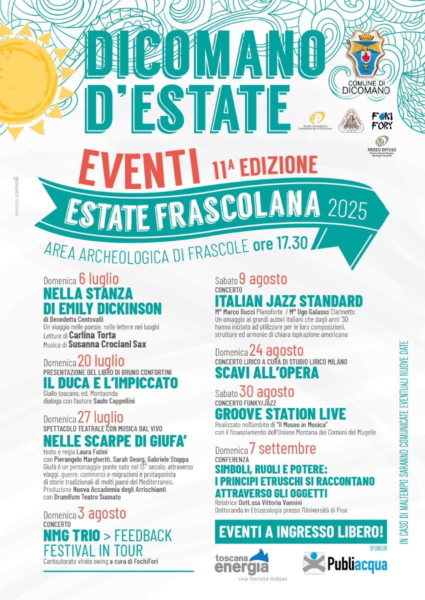 Torna l’Estate Frascolana, giunta alla sua 11ª edizione, con un ricco calendario di eventi culturali e musicali nella suggestiva Area Archeologica di Frascole a Dicomano, ogni appuntamento alle ore 17:30.