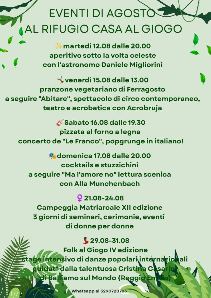 • Dal 29 al 31 agosto: IV edizione di "Folk al Giogo", uno stage intensivo di danze popolari internazionali guidato dalla talentuosa Cristina Casarini di Balliamo sul Mondo (Reggio Emilia).