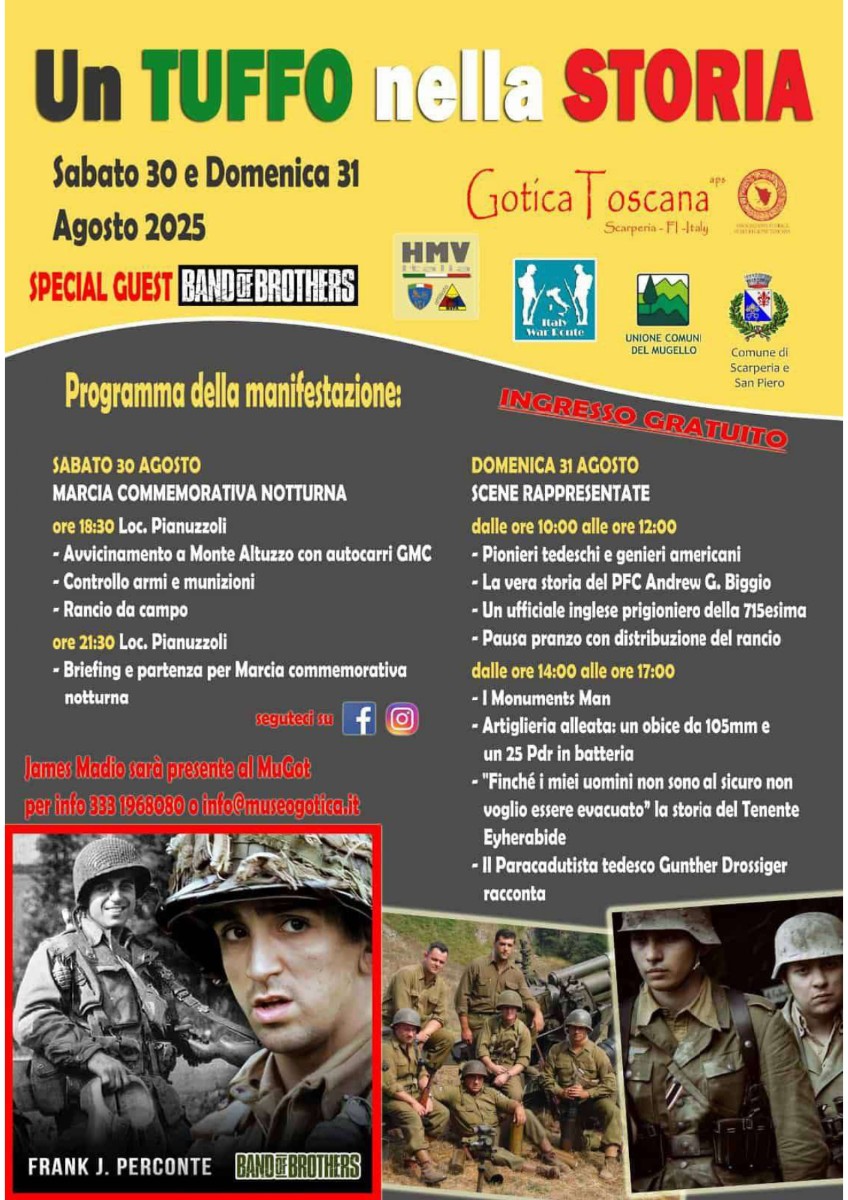 Un fine settimana dedicato alla memoria e alla rievocazione storica organizzato da Gotica Toscana APS presso il Mugello, con la partecipazione straordinaria di James Madio, interprete di Frank J. Perconte nella celebre serie Band of Brothers.