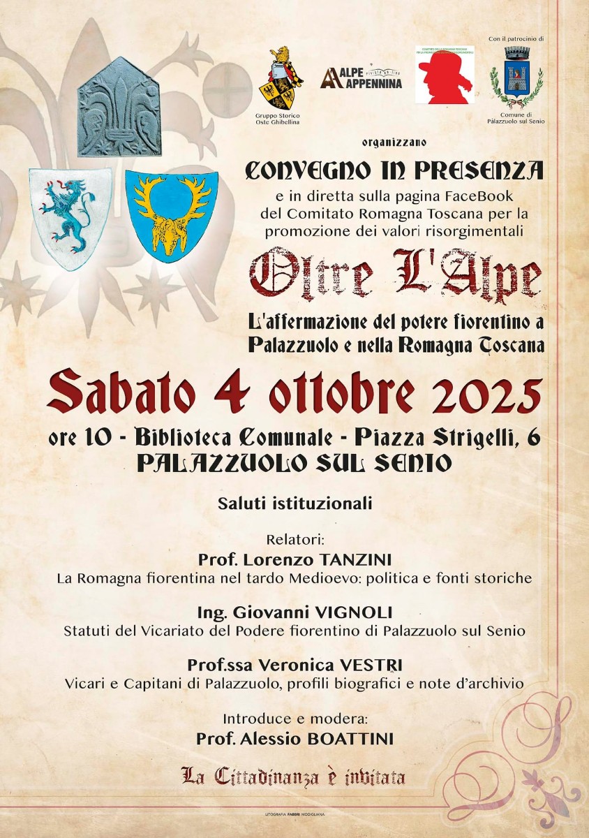 Il Comune di Palazzuolo sul Senio, con il patrocinio del Gruppo Storico Oste Ghibellina e dell’Associazione Alpe Appennina, organizza un importante convegno storico dedicato all’affermazione del potere fiorentino nel territorio di Palazzuolo e della Romagna Toscana.
