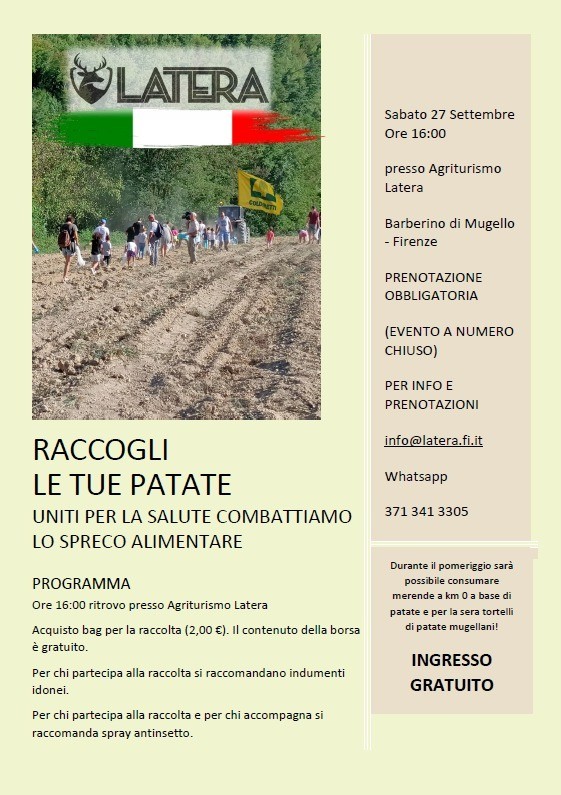 L’Agriturismo Latera organizza sabato 4 ottobre alle ore 16:00 un evento speciale dedicato alla natura, alla salute e alla lotta contro lo spreco alimentare: “Raccogli le tue patate”.