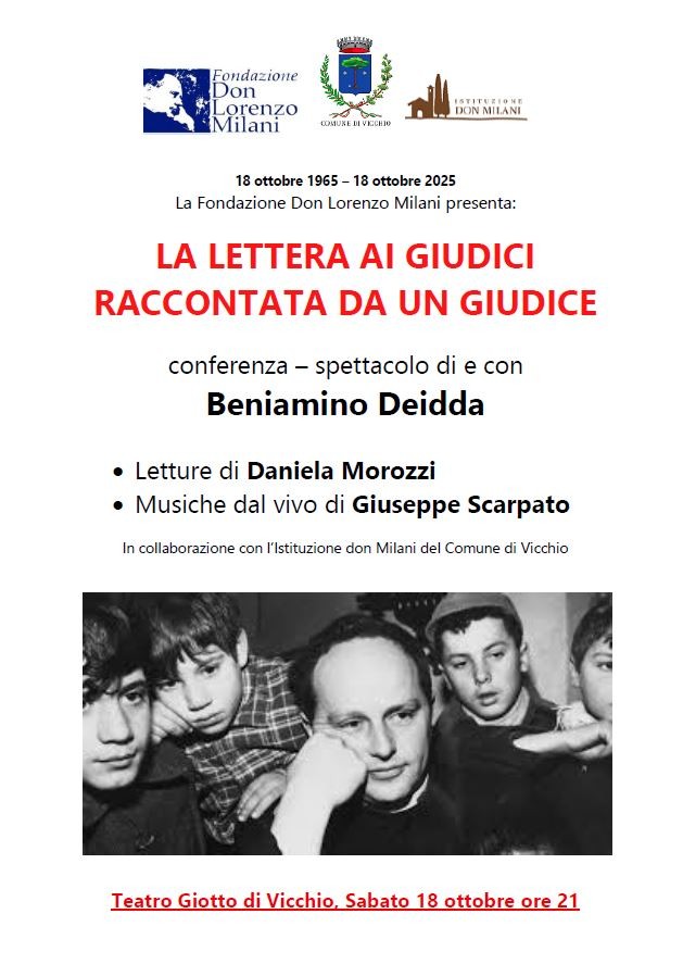 Sabato 18 ottobre, alle ore 21:00, presso il Teatro Giotto di Vicchio, la Fondazione Don Lorenzo Milani presenta un evento speciale per celebrare il sessantesimo anniversario (1965 – 2025) della sua opera: