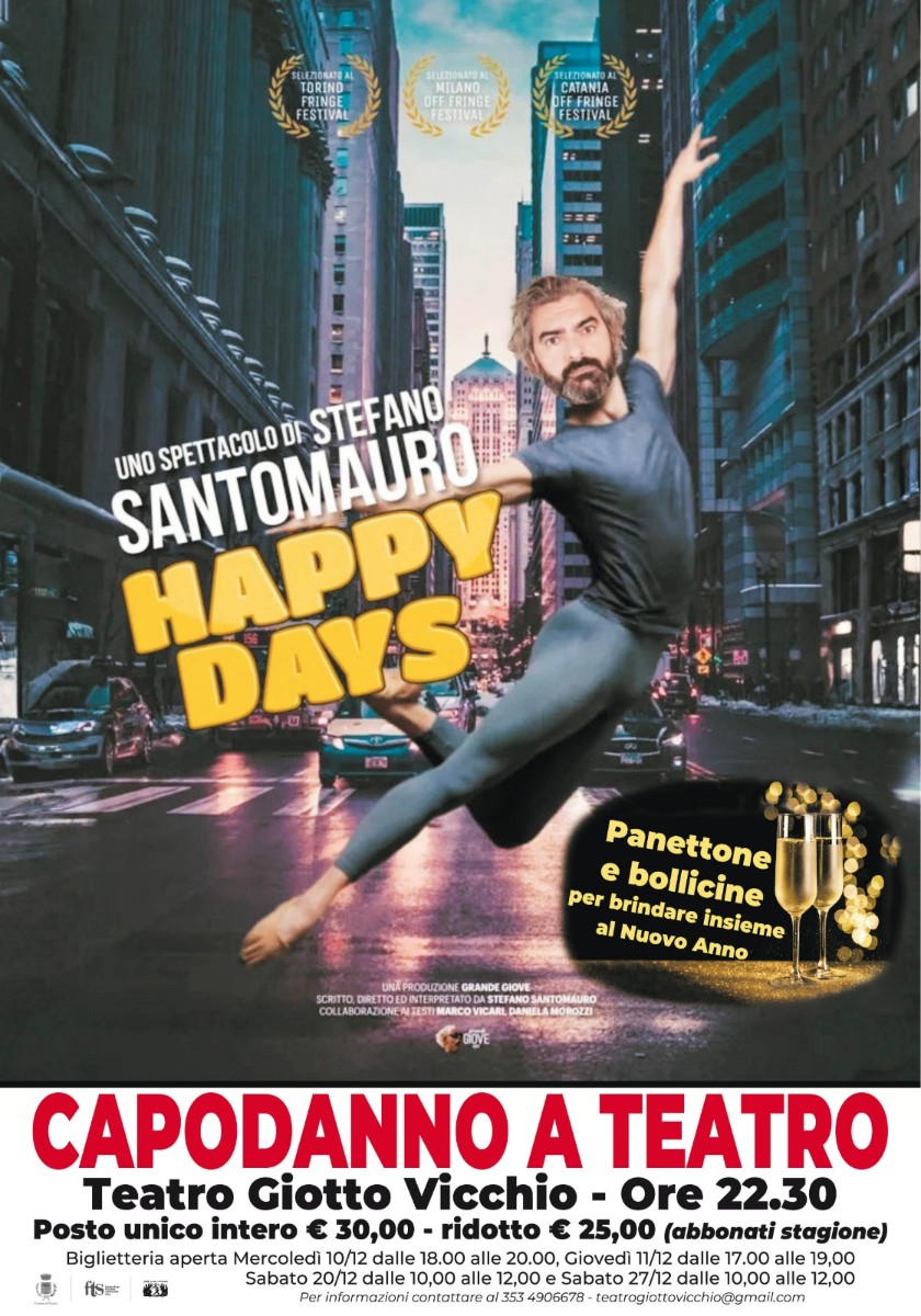 Stefano Santomauro e il suo spettacolo HAPPY DAYS ti guideranno in una ricerca della felicità fatta di ironia intelligente, risate vere e un pizzico di cinismo che funziona sempre