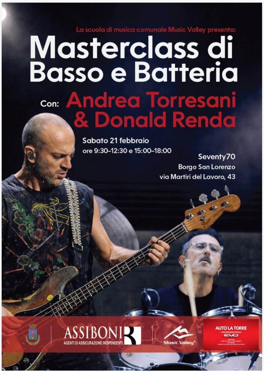 Masterclass di sezione ritmica con i musicisti di Vasco Rossi, Andrea Torresani (basso) e Donald Renda (batteria) alla Scuola Comunale di musica Marco da Galliano