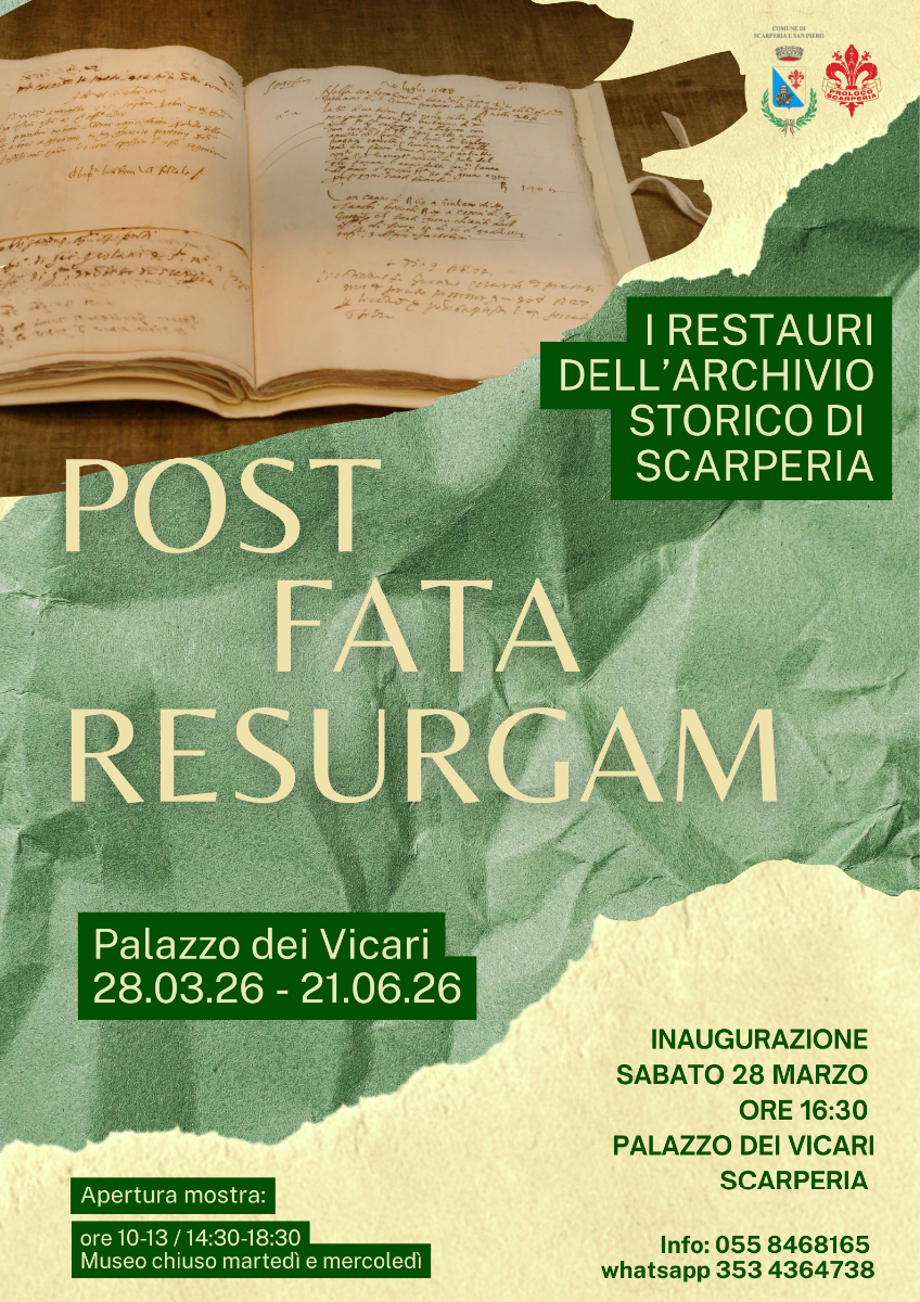 A 60 anni dall’alluvione di Firenze, che ha duramente colpito il patrimonio archivistico nazionale ma è stata anche motore di innovazioni nel campo del restauro, l’Archivio di Scarperia porta in mostra il suo patrimonio ferito e quello curato; un percorso nel dietro le quinte del lavoro archivistico per guardare alle carte con un occhio diverso, quello che si occupa di tutela, conservazione e tradizione nel futuro. La mostra è a cura della Biblioteca Comunale di Scarperia e della Pro Loco Scarperia con patrocinio del Comune di Scarperia e San Piero.
