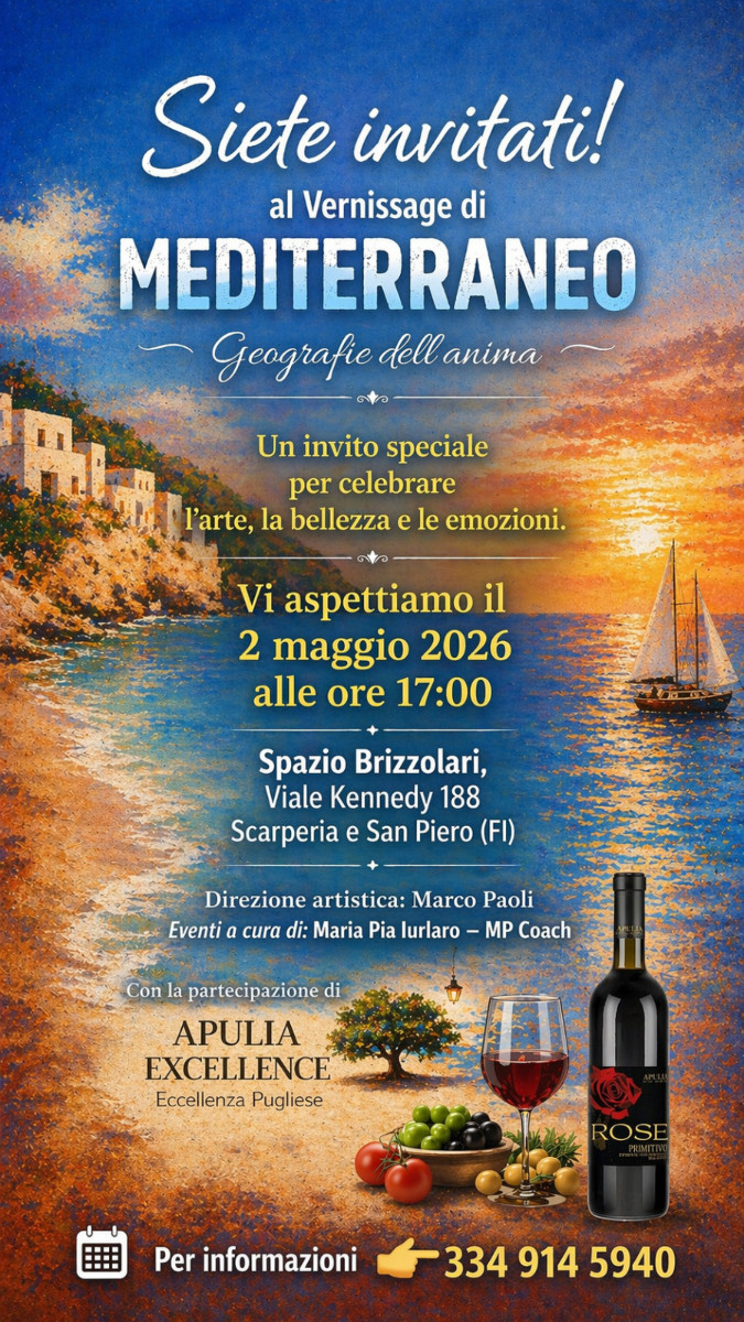 Una mostra collettiva che trasforma il mare in metafora: un viaggio sensoriale tra luce, acqua e terra, dal 2 al 17 maggio Il Mediterraneo non è solo una geografia. È una memoria condivisa, un’identità stratificata nei secoli, un paesaggio interiore prima ancora che fisico. È partendo da questa consapevolezza che prende forma “Mediterraneo. Geografie dell’anima”, mostra collettiva che inaugura sabato 2 maggio alle ore 17:00 allo Spazio Brizzolari di Scarperia e San Piero. Più che una semplice esposizione, la mostra si configura come un racconto corale capace di attraversare paesaggi reali e interiori. Le opere in mostra restituiscono la ricchezza cromatica e sensoriale di questo universo: coste assolate, borghi sospesi nel tempo, riflessi d’acqua e orizzonti infiniti convivono sulla parete come frammenti di un’unica, grande narrazione. Il mare come metafora Il filo conduttore dell’intera esposizione è il mare: non come soggetto pittoresco, ma come metafora vivente. Spazio di incontro tra civiltà, crocevia di storie millenarie, il Mediterraneo diventa nelle opere in mostra anche dimensione emotiva e spirituale – luogo dove l’identità si forma e si trasforma. «La luce – calda, avvolgente, vibrante – diventa elemento narrativo centrale, capace di trasformare ogni scena in un’esperienza al tempo stesso intima e universale.» Il percorso espositivo invita lo spettatore a lasciarsi guidare dalle suggestioni visive per riscoprire un legame profondo con la natura e con le radici culturali del Sud Europa. Non uno sguardo nostalgico, ma una riscoperta attiva: l’arte come strumento di connessione tra persone, luoghi ed emozioni. Arte, cibo e territorio: un dialogo a più voci Il vernissage del 2 maggio sarà un momento di incontro e celebrazione, arricchito dalla partecipazione di eccellenze enogastronomiche, tra cui Apulia Excellence. La presenza dei vino.